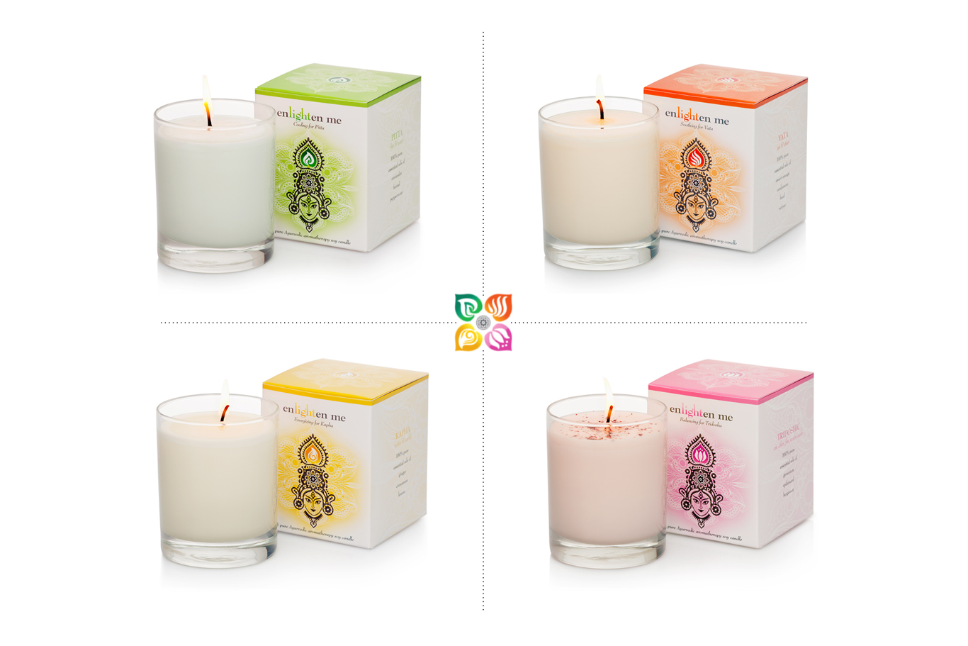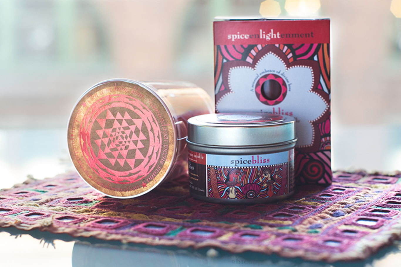Pure essential oils and long burning soy wax brought the product quality. Crisp colour and bold Vedic symbology told the story inspired by the sacred folk art of Madhubane, India.