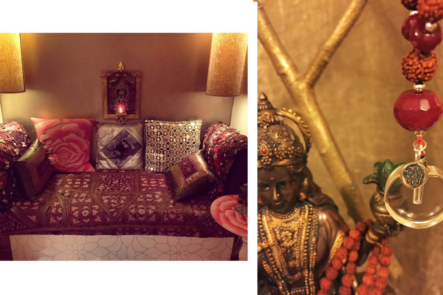 Accents were white embossed lotus flower wallpaper, matte silver and gold wall, Moroccan lights, and tribal Rajasthani fabrics.